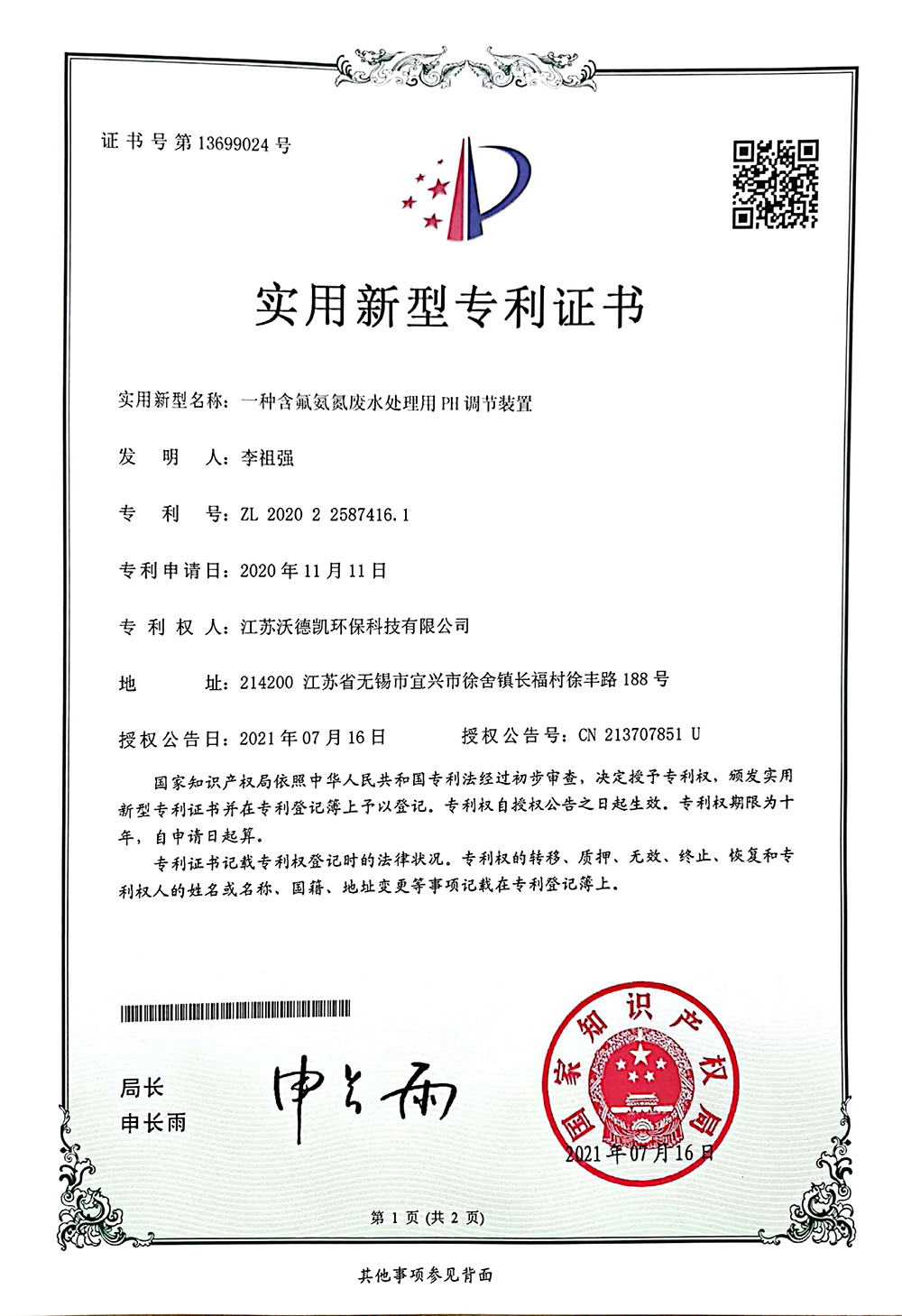 当前位置:首页>>关于我们>>荣誉资质>>含氟氨氮废水处理用PH调节装置