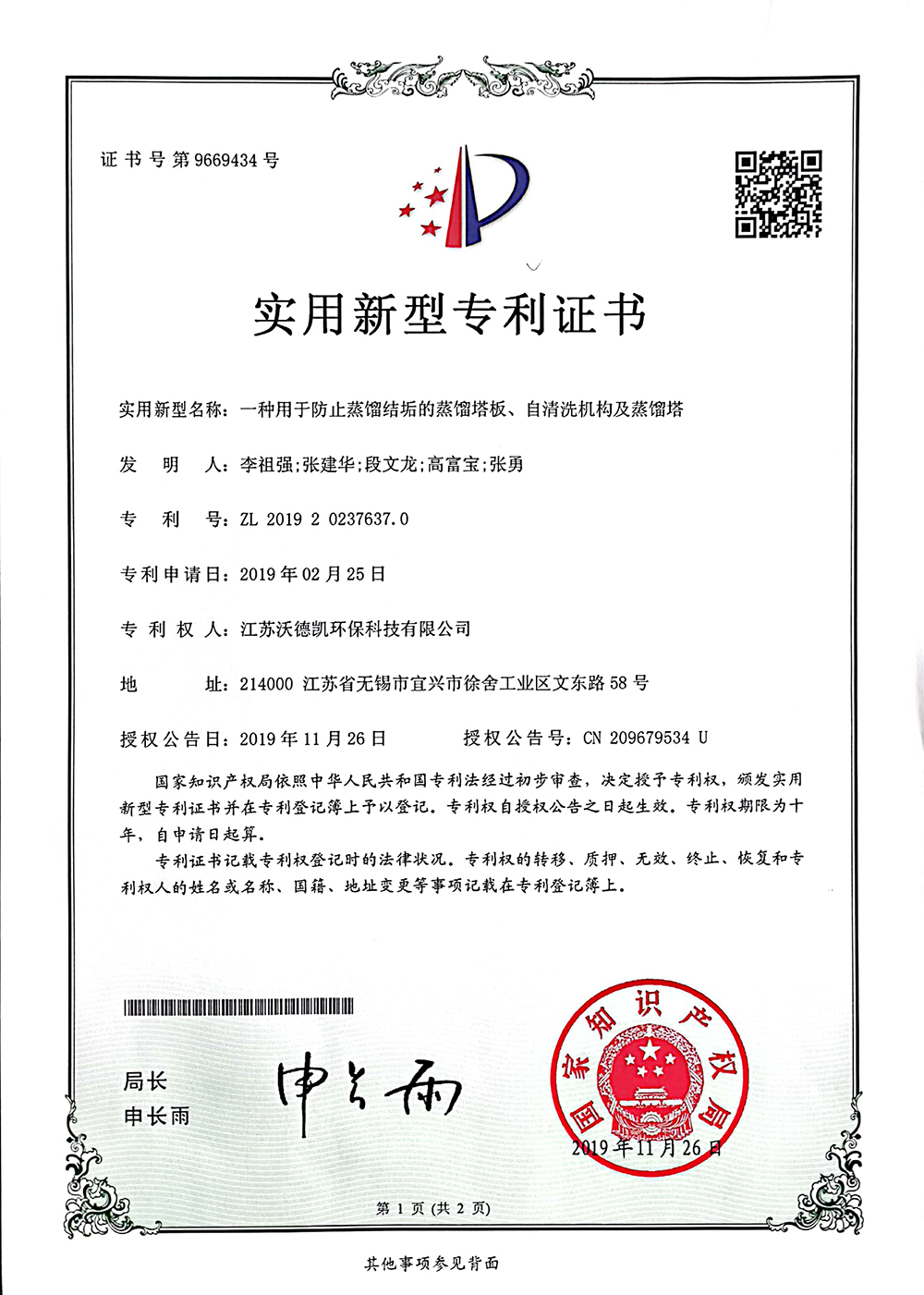当前位置:首页>>关于我们>>荣誉资质>>防止蒸馏结垢的蒸馏塔板、自清洗极高及蒸馏塔